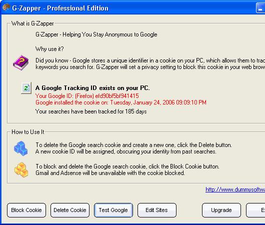 Note: IF u block Google cookie then u wont be able to access gmail or google adsense.so better dont block it G-zapper will delete the cookie when it detects G-Zapper is available in two versions. The Free Edition and Professional Edition.Â