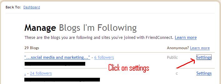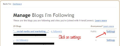 3)Then a new dialog box will open ,choose the blog you want to unfollow ,click settings