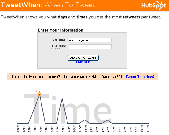 “Tweet when” is a easy to use tool that analyzes you past 1000 tweets and gives you a clear graphical analysis of the best time of the day when your tweets gets maximum retweets. I would suggest using a tweet scheduler tool so that you get the maximum out of your tweets.Enjoy tweeting and get the maximum advantage out of twitter.